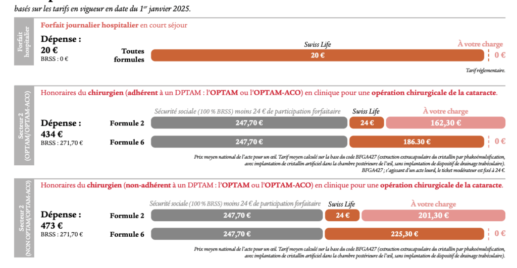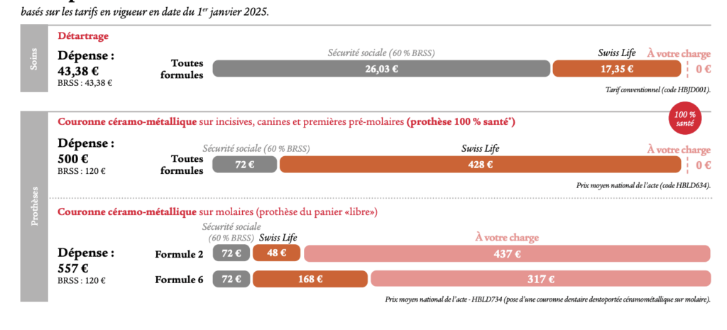 Notez toutefois que dans certaines conditions, la totalité de l’acte sera couverte par Swiss Life, si la couverture (par exemple, 400 % du BRSS) suffit. Voici quelques exemples.
